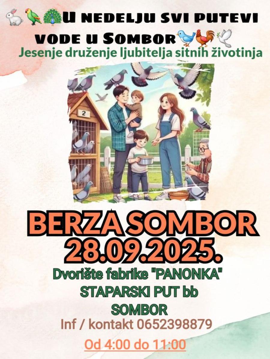 Berza sitnih životinja, najveća ove vrste u ovom delu Balkana, će se održati u dvorištu odnosno na prostoru fabrike „Panonka“ na Staparskom putu bb. Posetioci će imati priliku da pogledaju i kupe ptice, živinu, zečeve i druge sitne životinje, kao i opremu i hranu za njih. Vrata objekta za izlagače će biti otvorena već u 4 sata, dok će posetioci berzu moći da obiđu do 12 sati.