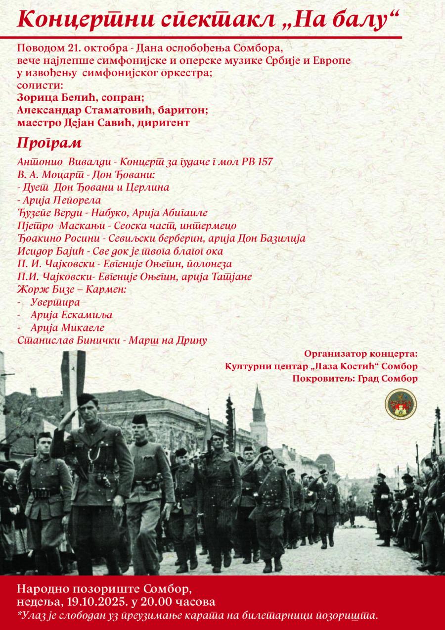 Povodom proslave 21. oktobra – Dana oslobođenja Sombora u nedelju, 19.10.2025. godine, organizuje se koncertni spektakl „Na balu“ u Narodnom pozorištu Sombor.