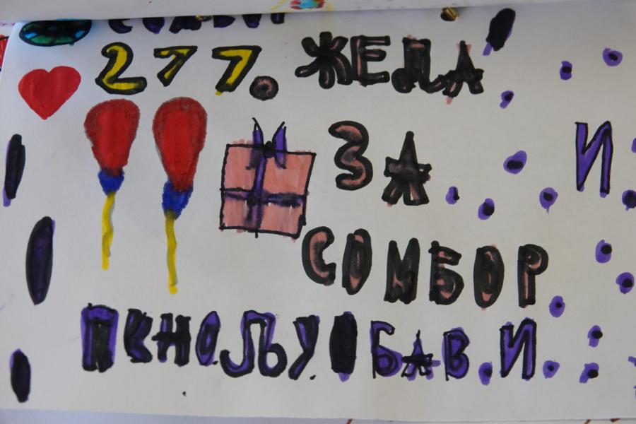 Mališani su inspirisani posetom i pričom o gradu nacrtali svako svoju čestitku sa raznovrsnim porukama i rođendanskim željama, a za uzvrat su dobili poklon bojanke.