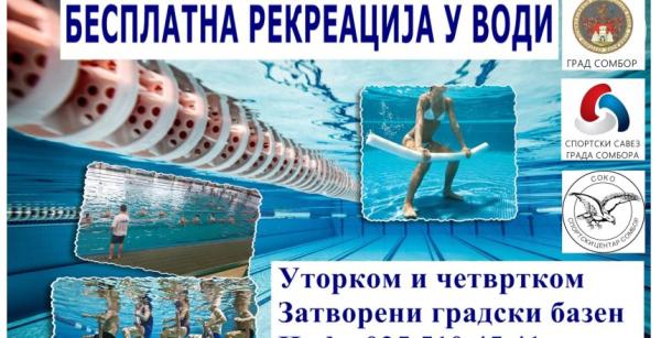 U Somboru u utorak 10.02.2026. godine startuje program Besplatna rekreacije u vodi za građane grada Sombora. Program se realizuje u Zatvorenom bazenu Sportskog centra „Soko„ u Somboru i to u terminima UTORКOM I ČETVRTКOM od 16:00 do 17:00 časova. Rekreacija u vodi ili aerobik u vodi, poslednjih godina sve je popularniji jer je dokazano da je vežbanje u vodi neuporedivo efikasnije nego u sali. Sve što vam je potrebno su kupaći kostim, peškir i želja…