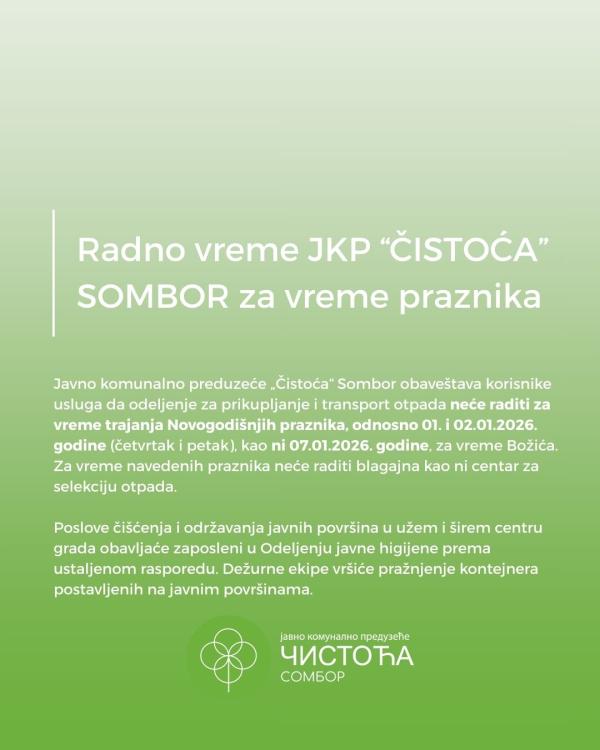 Javno komunalno preduzeće „Čistoća“ Sombor obaveštava korisnike usluga da odeljenje za prikupljanje i transport otpada neće raditi za vreme trajanja Novogodišnjih praznika, odnosno 01. i 02.01.2026. godine (četvrtak i petak), kao ni 07.01.2026. godine, za vreme Božića.Za vreme navedenih praznika neće raditi blagajna kao ni centar za selekciju otpada. Poslove čišćenja i održavanja javnih površina u užem i širem centru grada obavljaće zaposleni u Odeljenju javne higijene prema ustaljenom rasporedu. Dežurne ekipe vršiće pražnjenje kontejnera…