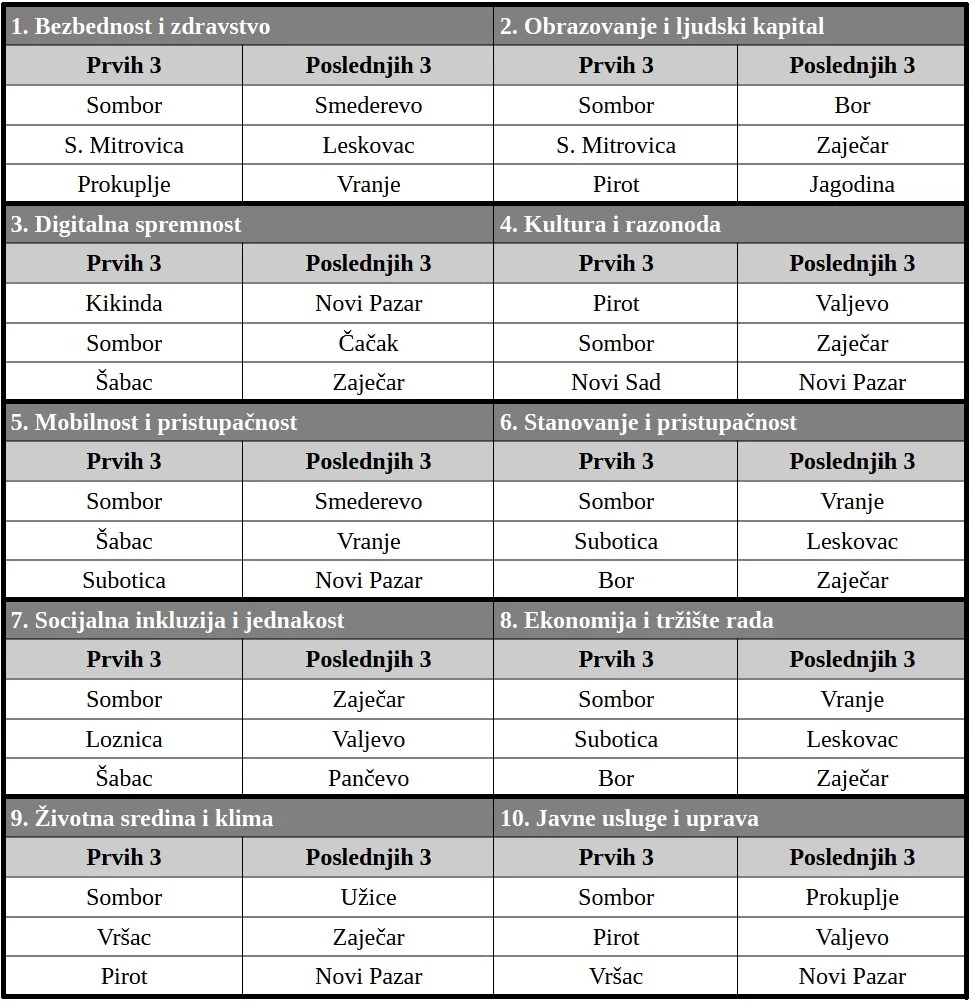 Posmatranih 10 kategorija, rangirali su prema svojem viđenju njihovog značaja za kvalitet života. Građanima su prioritet bezbednost i zdravstvena zaštita. Sledi obrazovanje i ljudski kapital, a na trećem mestu spremnost na usvajanje digitalnih tehnologija. Na začelju, ali ne mnogo manje važno su ekonomija i tržište rada gde su između ostalog ocenjivali mogućnost da nađu posao. Takođe i zaštita životne spremine, kao i javne usluge u lokalnoj samoupravi.