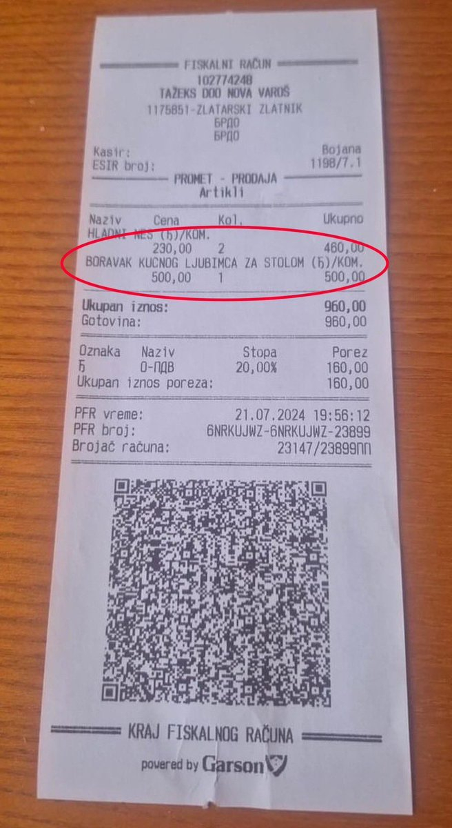 Društvenim mrežama se deli fotografija računa iz jednog kafića iz Nove Varoši u kojem stoji da se naplaćuje 500 dinara boravak kućnog ljubimca za stolom.