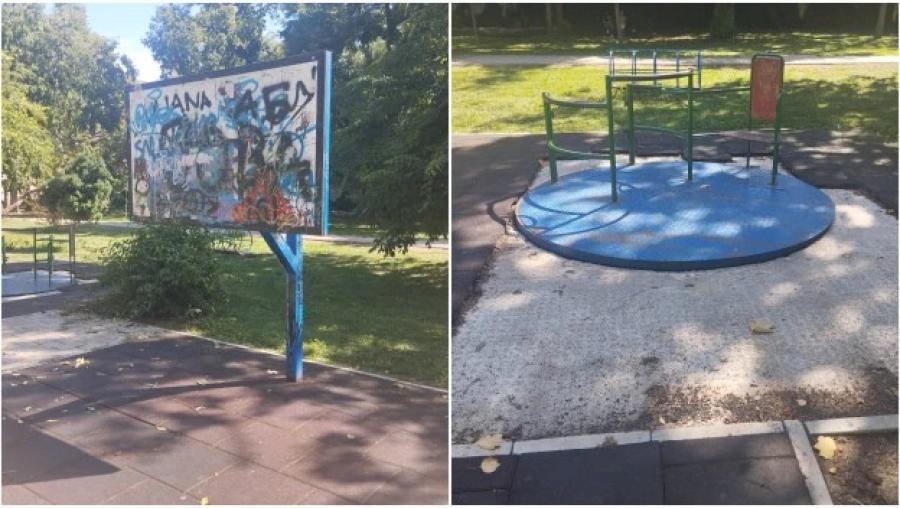 Kvadratne ploče elastične podloge koja je postavljena zarad bezbednosti dece izvaljene su i nestale, košarkaška tabla koju su koristila deca u kolicima bez obruča je i potpuno išarana, rotacioni karusel nakrivljen...