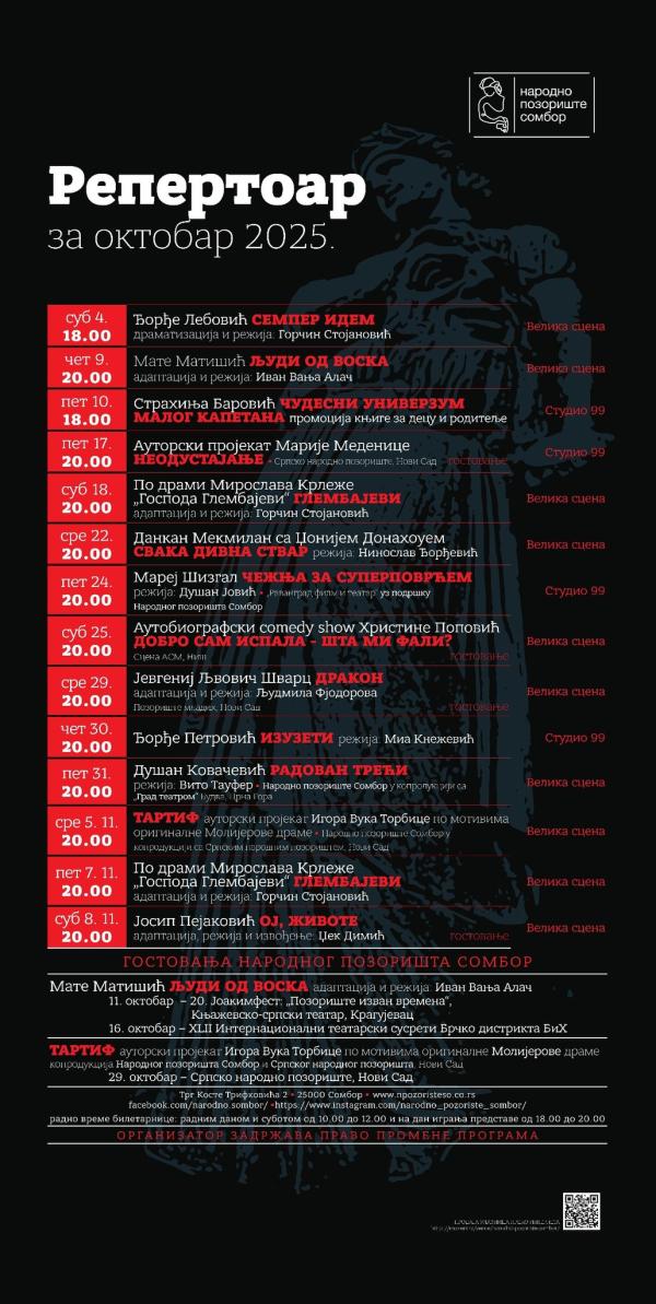 Narodno pozorište Sombor objavilo je program koji će posetioci ove ustanove kulture imati priliku pogledati tokom oktobra meseca 2025. godine. Ulaznice su u prodaji, a u nastavku vam donosimo kompletan repertoar: Subota, 4. oktobar u 18 sati, Velika scena – Đorđe Lebović, SEMPER IDEM, u dramatizaciji i režiji Gorčina Stojanovića Četvrtak, 9. oktobar u 20 sati, Velika scena – Mate Matišić, LJUDI OD VOSKA, u adaptaciji Ivana Vanje Alača Petak, 10. oktobar u 18 sati,…