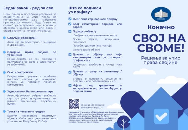 Novi Zakon o posebnim uslovima za evidentiranje i upis prava na nepokretnostima (u javnosti poznat kao zakon o legalizaciji) daje građanima priliku da budu registrovani kao vlasnici objekata u kojima žive ili rade, i stavlja tačku na nelegalnu gradnju, piše na sajtu Republičkog geodetskog zavoda (RGZ) uz boršuru kako izgleda postupak prijave. Navodi se da će odluke o evidentiranju donositi Agencija za prostorno planiranje i urbanizam, a cela procedura sprovodiće se isključivo onlajn, preko nove…