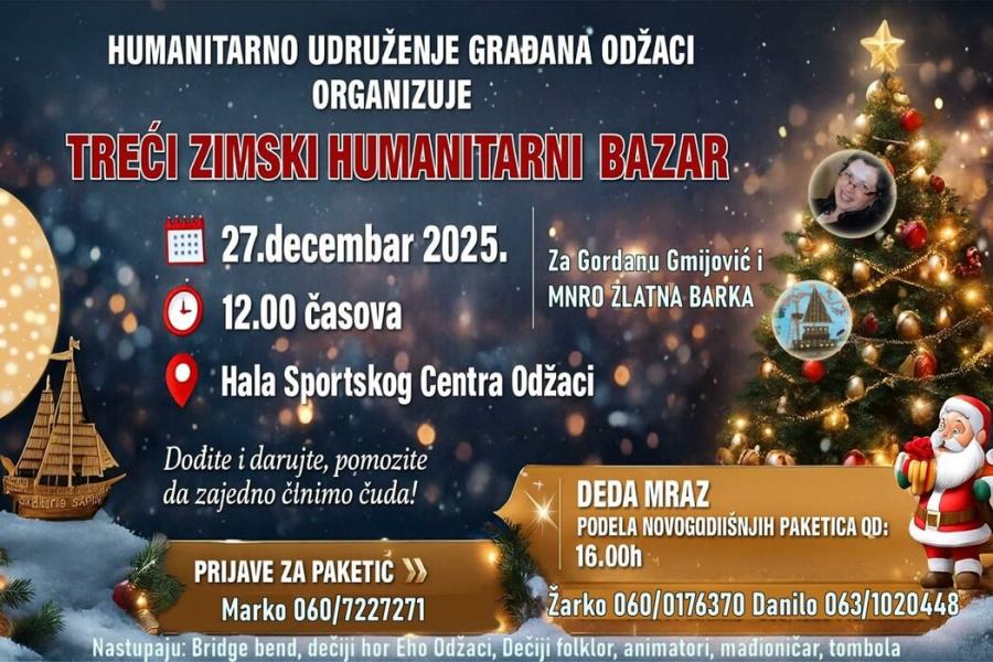 Humanitarno udruženje građana Odžaci organizuje treći Zimski humanitarni bazar, koji će biti održan u subotu, 27. decembra 2025. godine, sa početkom u 12 časova, u Hali Sportskog centra Odžaci.